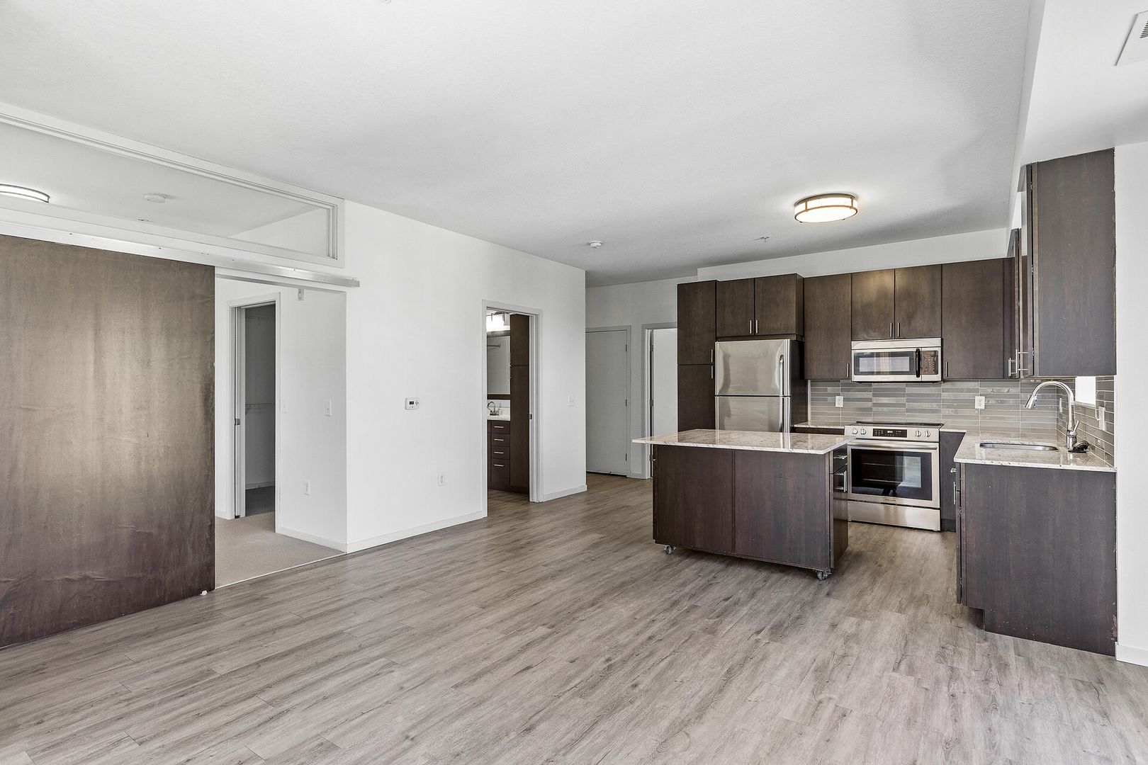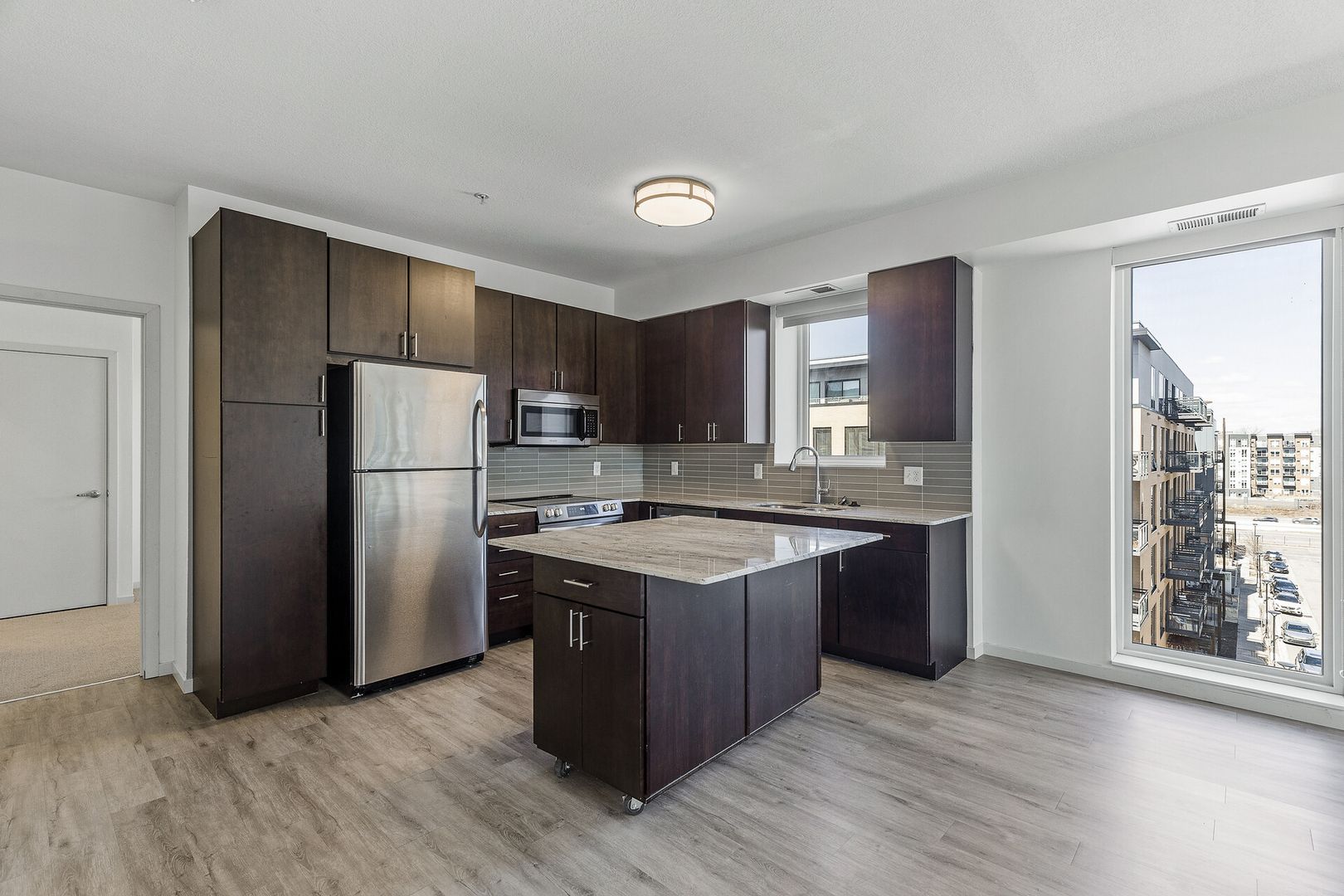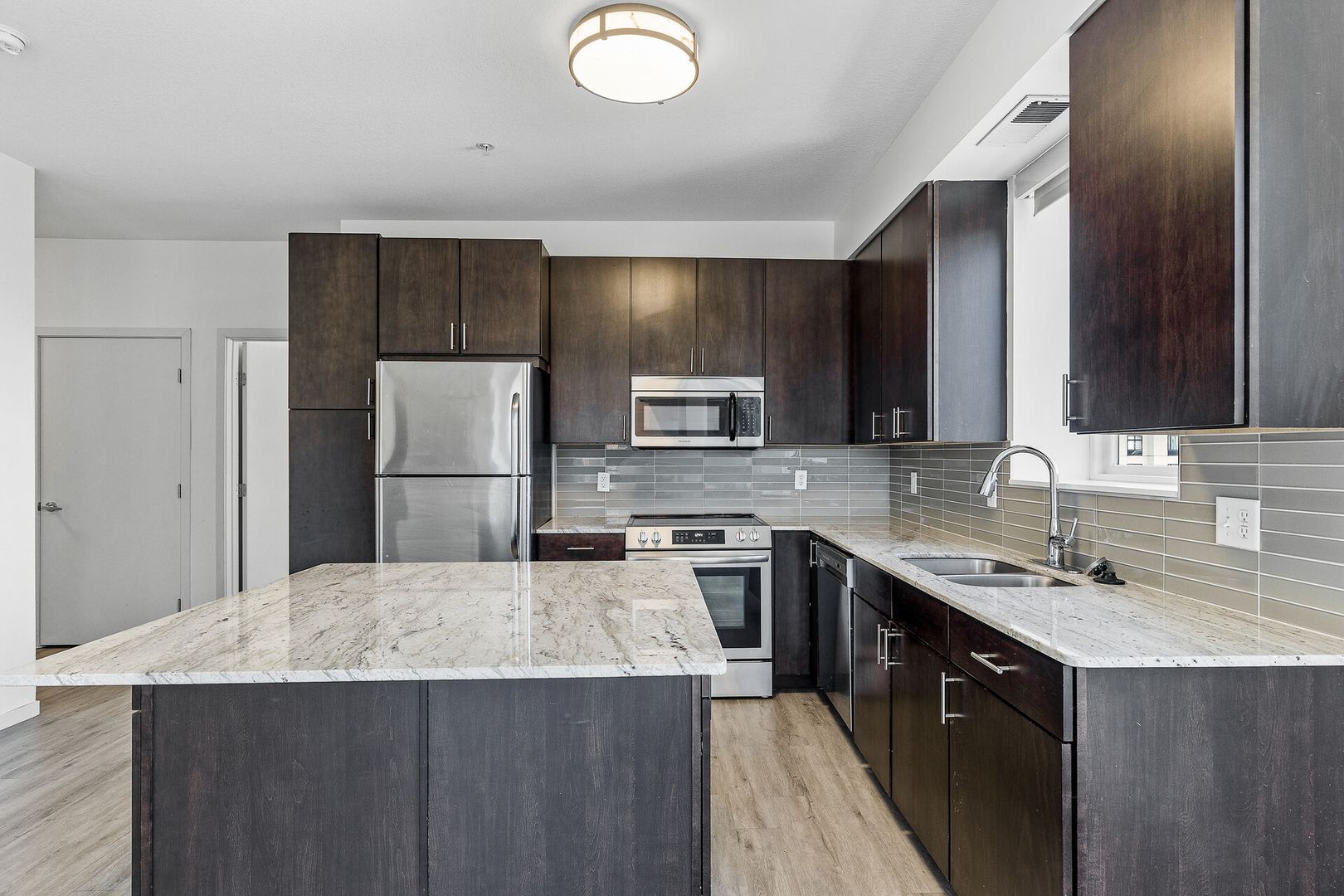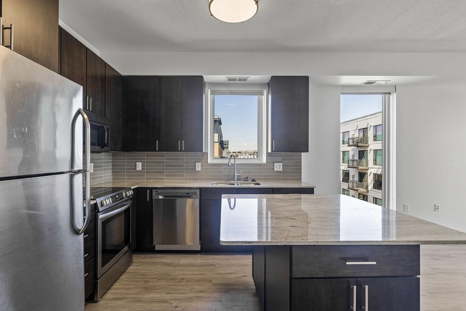 Experience contemporary luxury in this thoughtfully designed apartment, where sleek finishes and modern conveniences create the perfect place to call home. The open-concept kitchen is a statement of style and functionality, featuring rich espresso cabinetry, striking glass-tile backsplash, gleaming granite countertops, and a spacious kitchen island—perfect for cooking, entertaining, or casual dining. The high-end premium appliances package completes the space, blending seamlessly with the modern aesthetic.