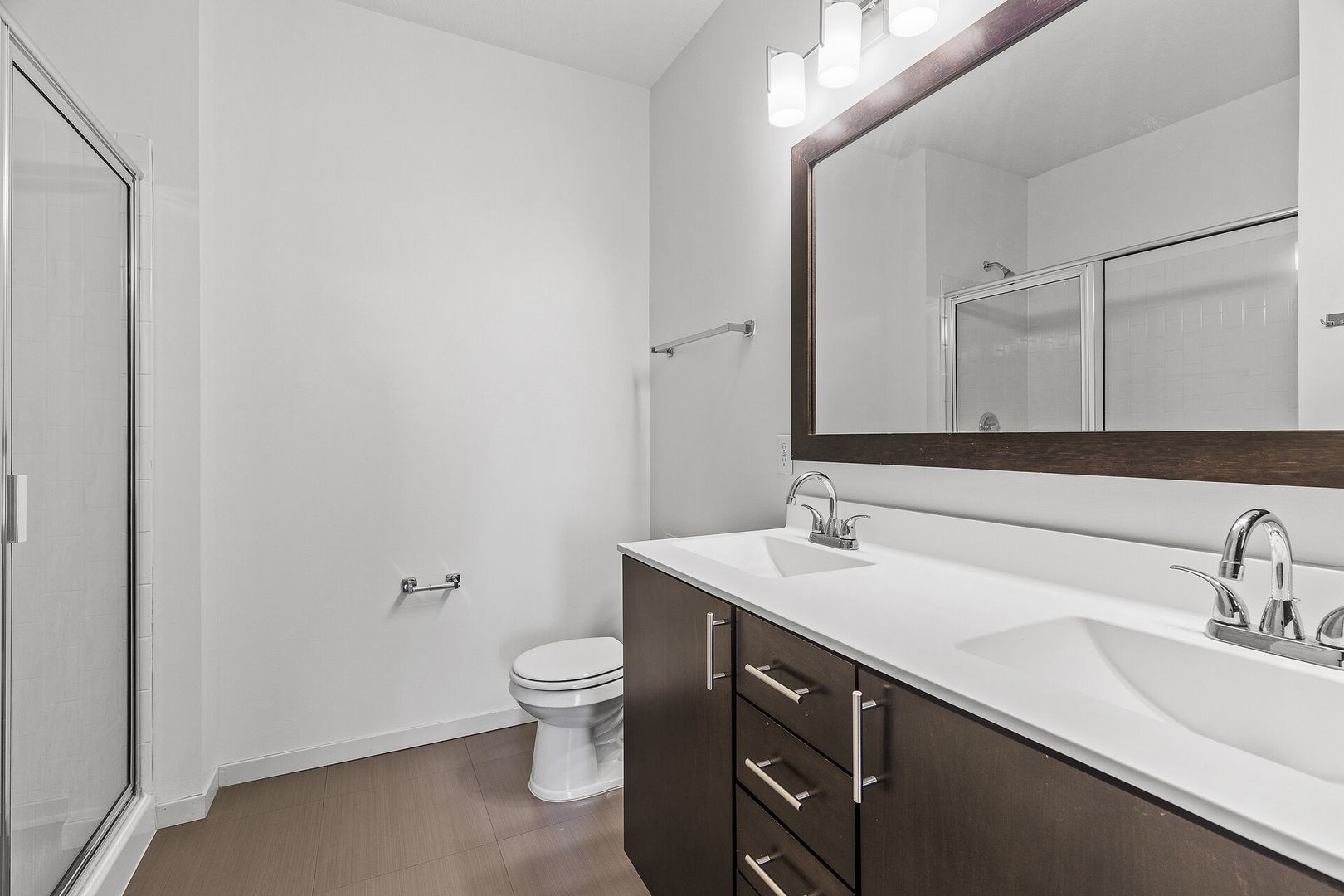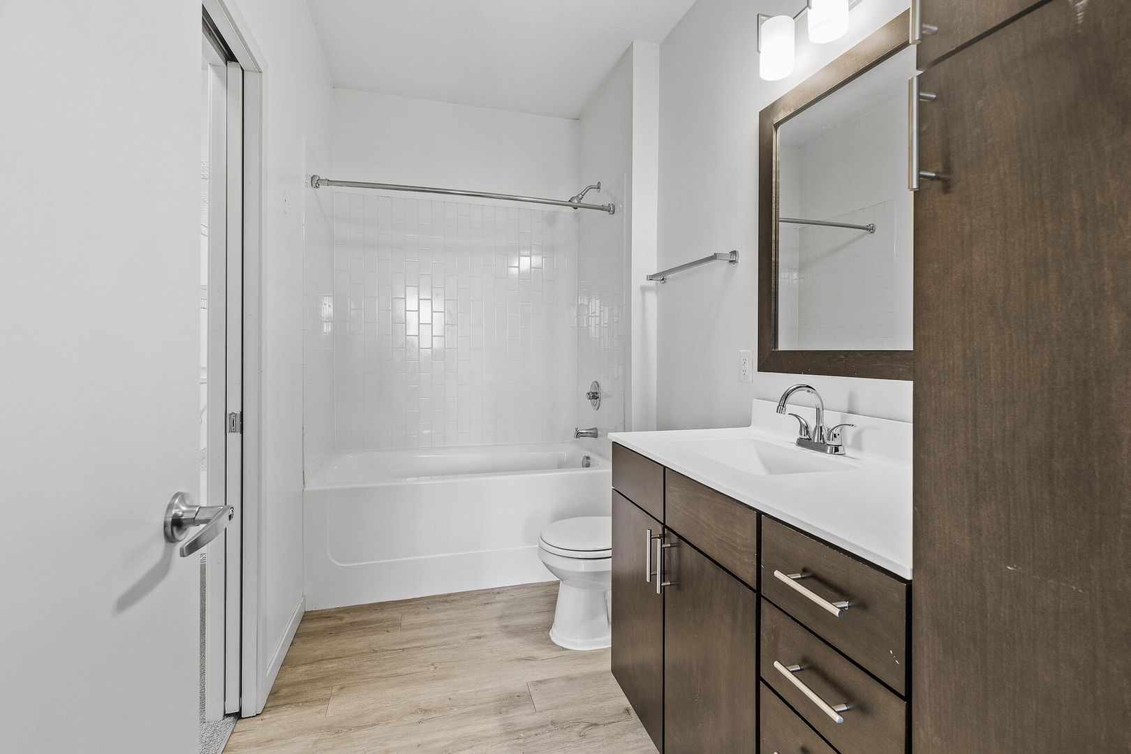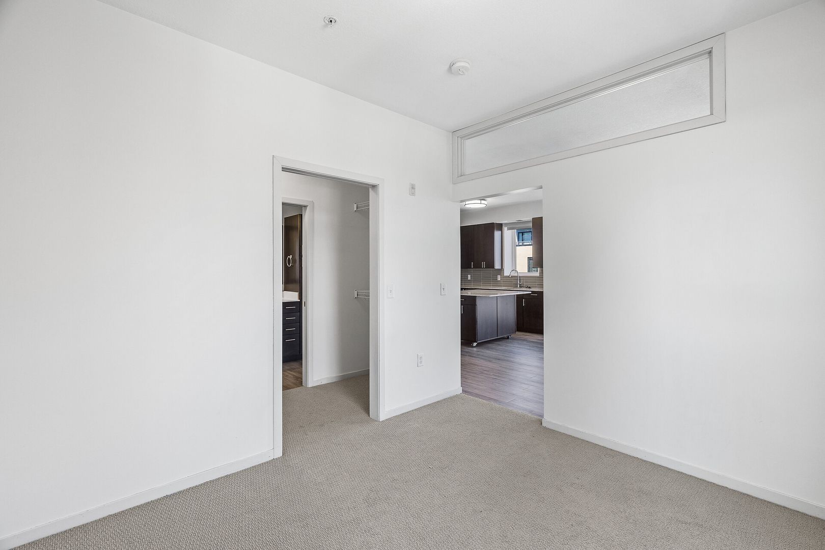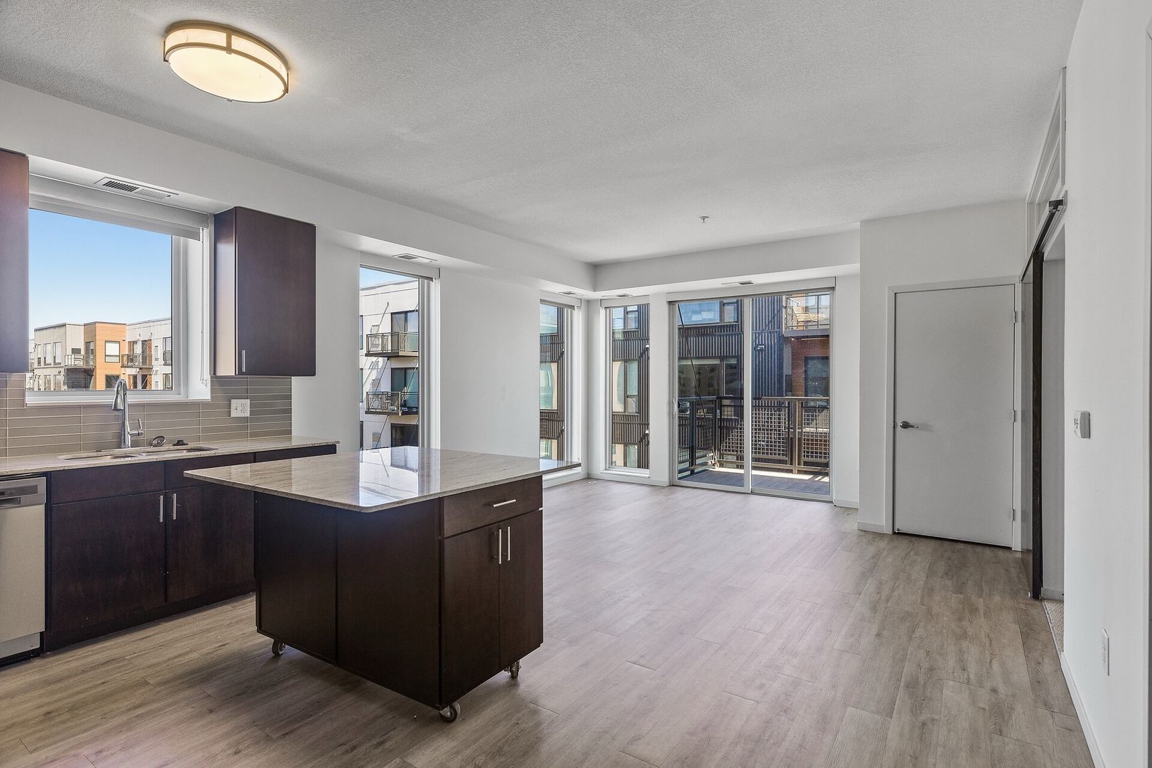 Experience contemporary luxury in this thoughtfully designed apartment, where sleek finishes and modern conveniences create the perfect place to call home. The open-concept kitchen is a statement of style and functionality, featuring rich espresso cabinetry, striking glass-tile backsplash, gleaming granite countertops, and a spacious kitchen island—perfect for cooking, entertaining, or casual dining. The high-end premium appliances package completes the space, blending seamlessly with the modern aesthetic.
