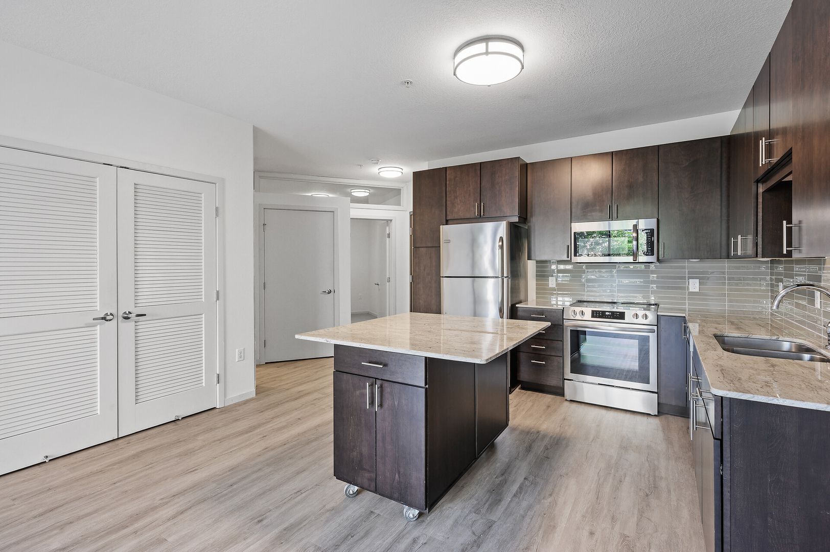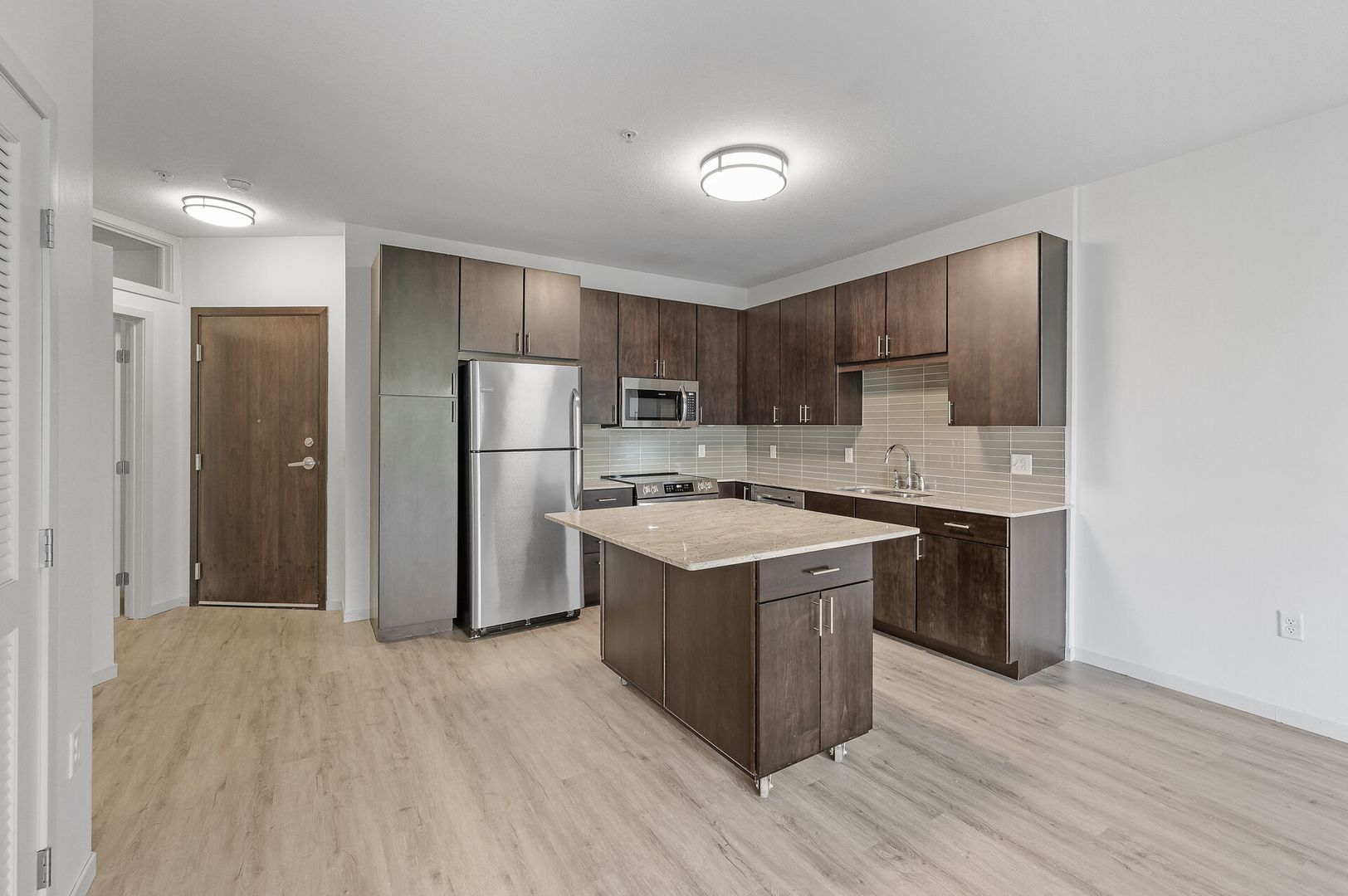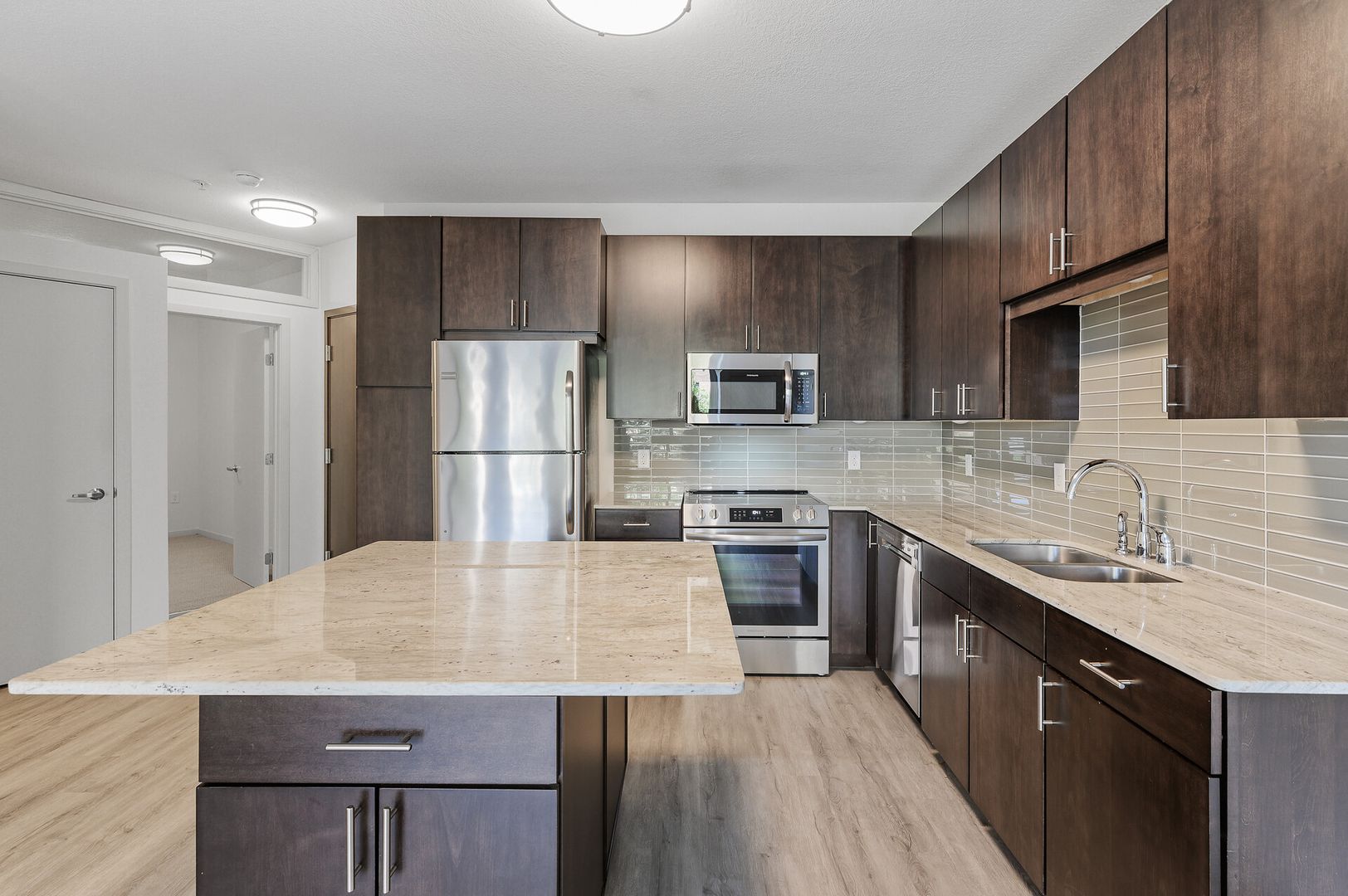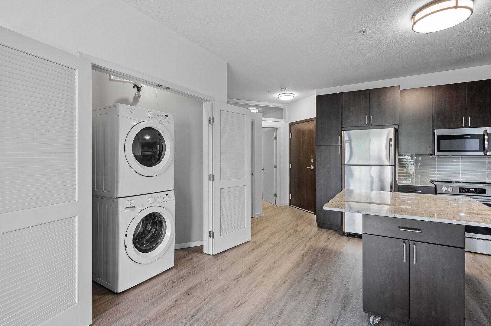 Experience contemporary luxury in this thoughtfully designed apartment, where sleek finishes and modern conveniences create the perfect place to call home. The open-concept kitchen is a statement of style and functionality, featuring rich espresso cabinetry, striking glass-tile backsplash, gleaming granite countertops, and a spacious kitchen island—perfect for cooking, entertaining, or casual dining. The high-end premium appliances package completes the space, blending seamlessly with the modern aesthetic.