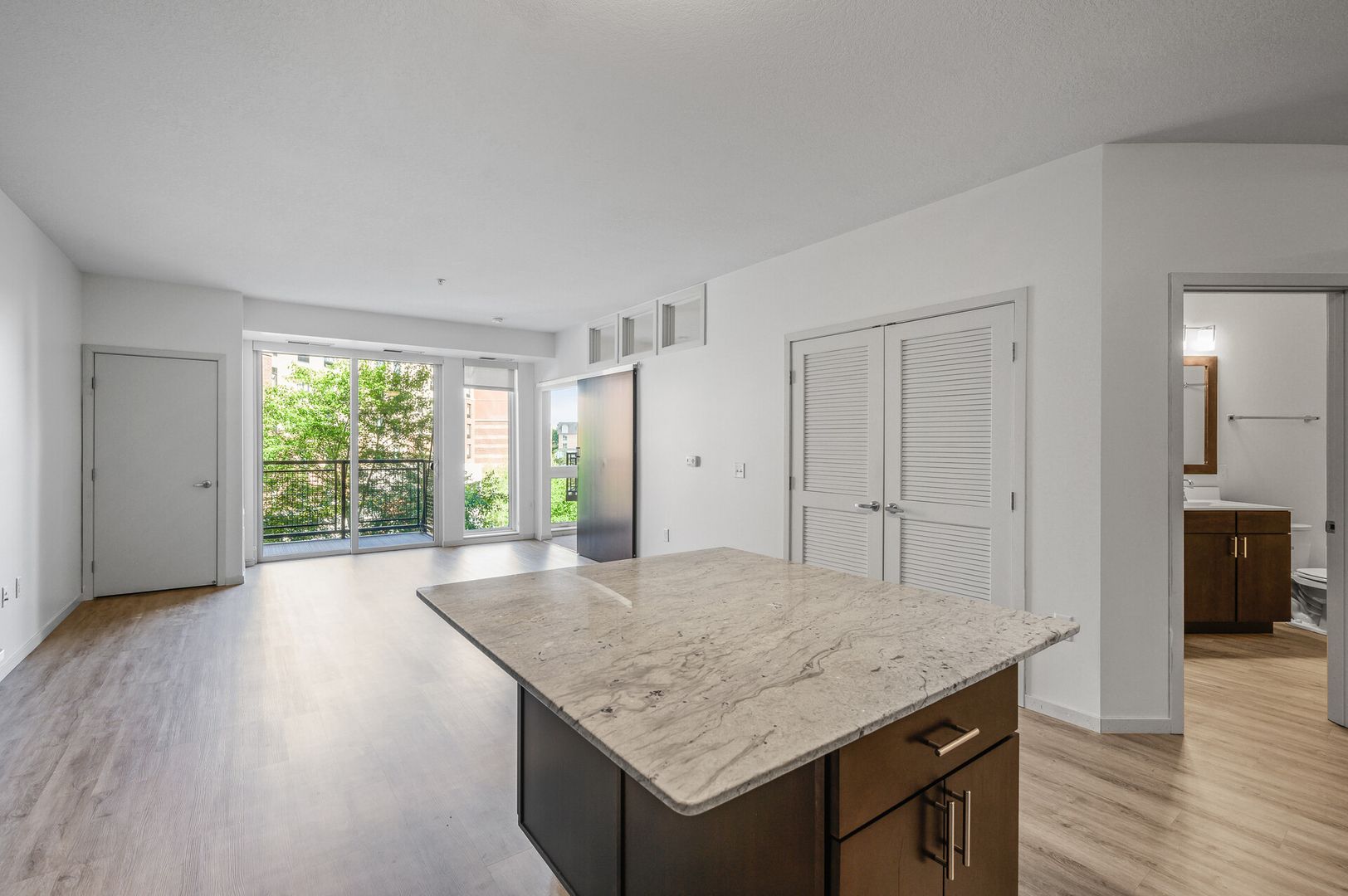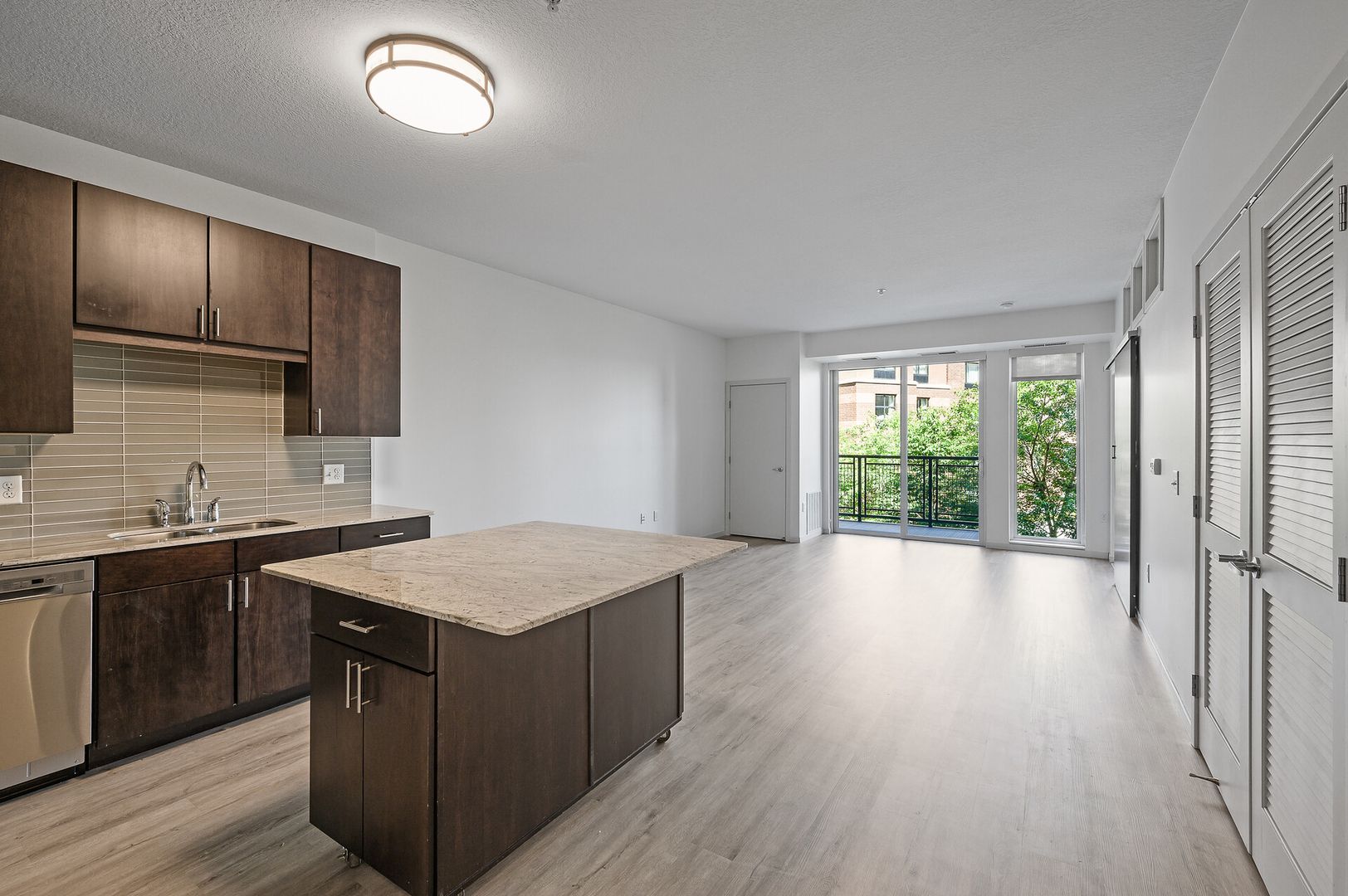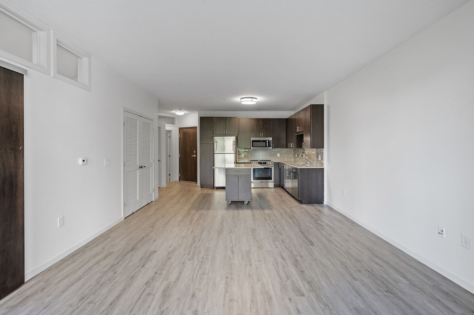 Experience contemporary luxury in this thoughtfully designed apartment, where sleek finishes and modern conveniences create the perfect place to call home. The open-concept kitchen is a statement of style and functionality, featuring rich espresso cabinetry, striking glass-tile backsplash, gleaming granite countertops, and a spacious kitchen island—perfect for cooking, entertaining, or casual dining. The high-end premium appliances package completes the space, blending seamlessly with the modern aesthetic.