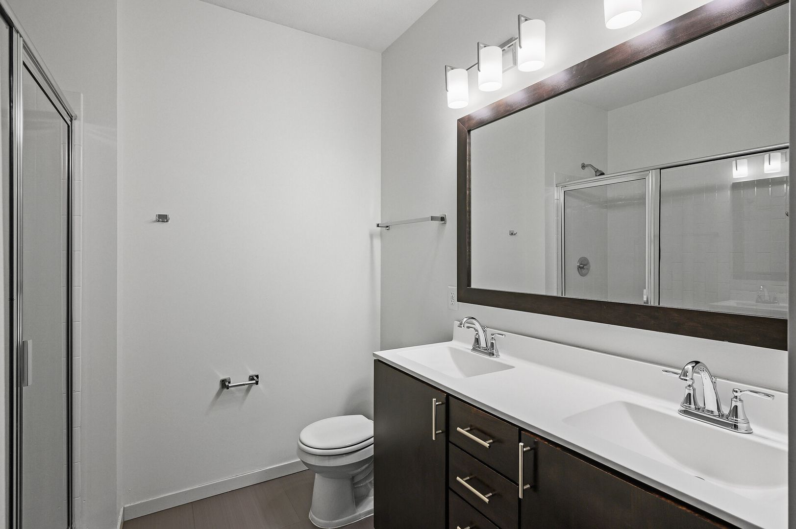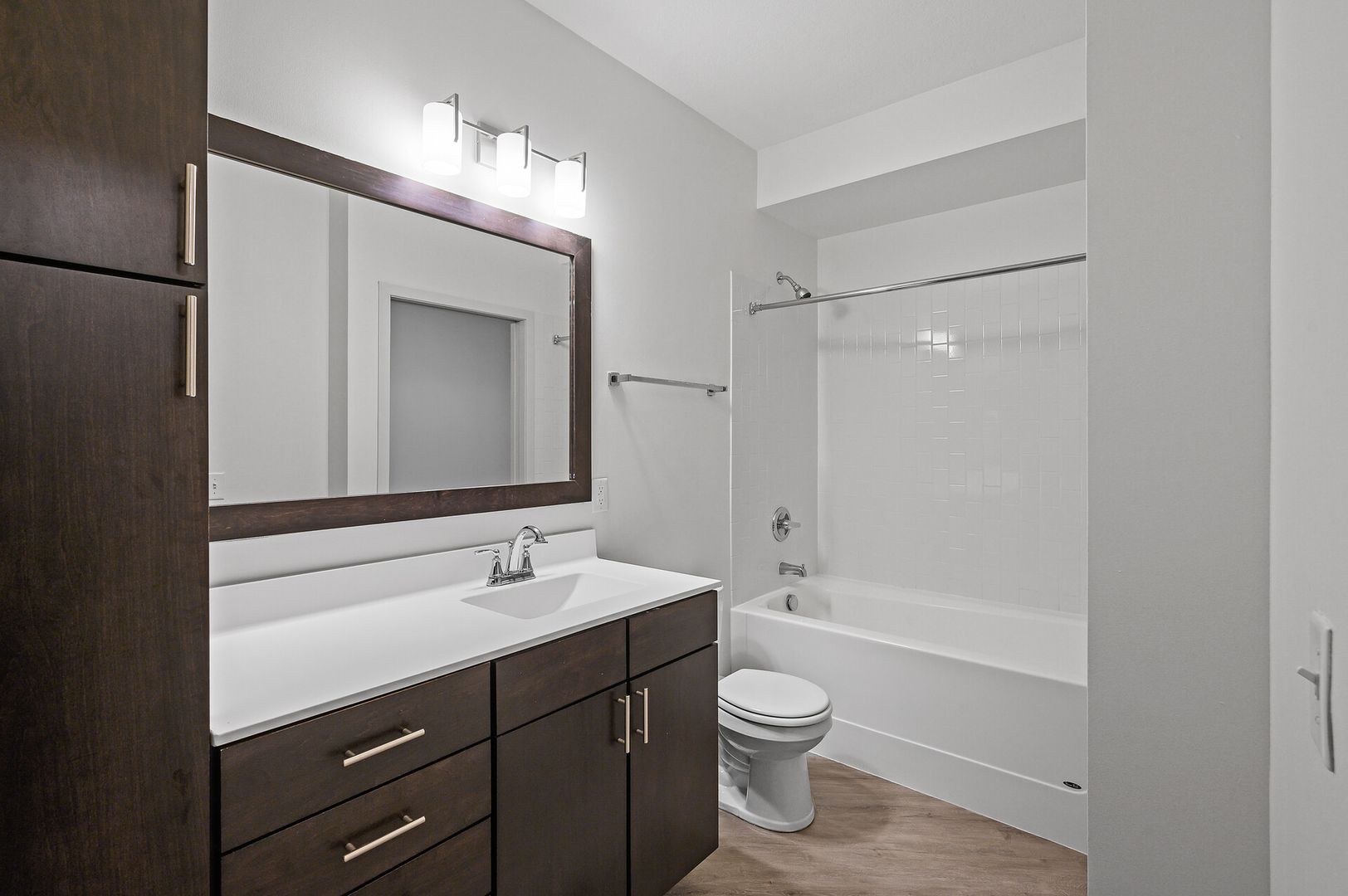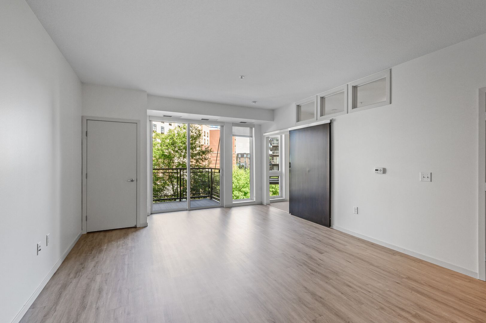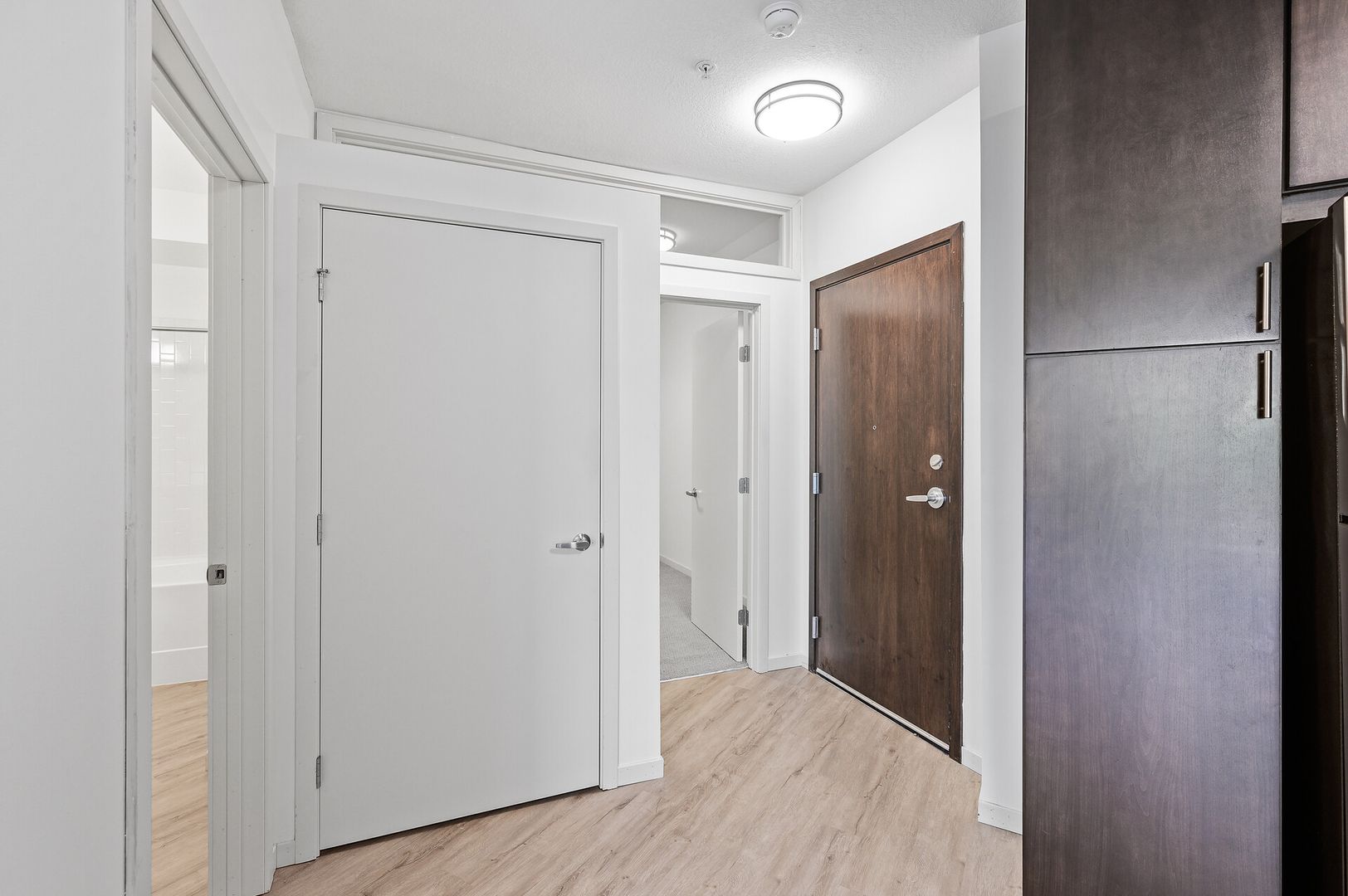 Experience contemporary luxury in this thoughtfully designed apartment, where sleek finishes and modern conveniences create the perfect place to call home. The open-concept kitchen is a statement of style and functionality, featuring rich espresso cabinetry, striking glass-tile backsplash, gleaming granite countertops, and a spacious kitchen island—perfect for cooking, entertaining, or casual dining. The high-end premium appliances package completes the space, blending seamlessly with the modern aesthetic.